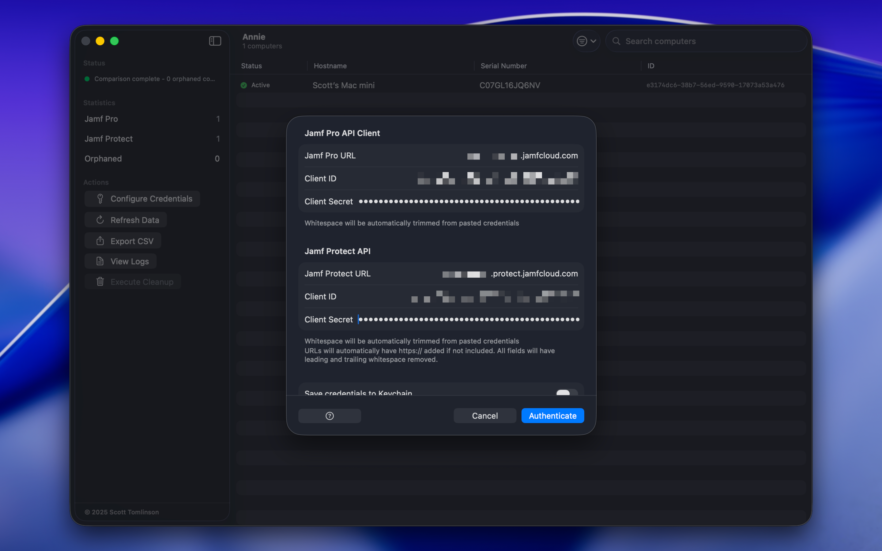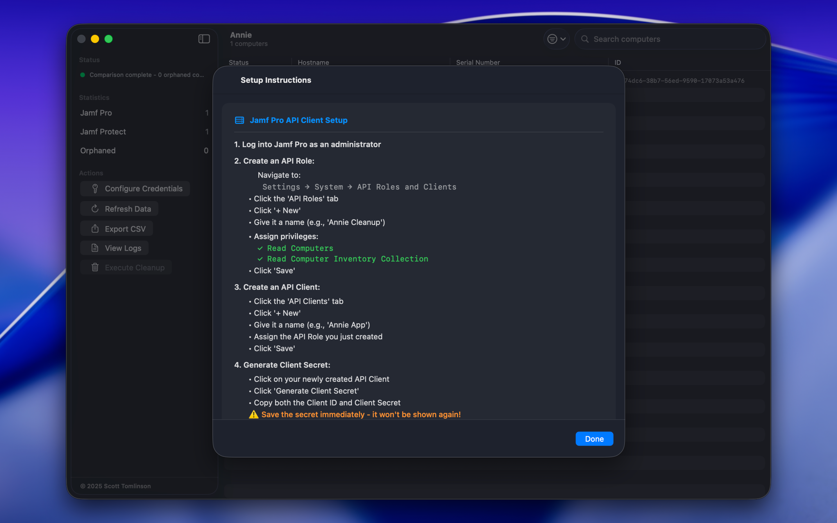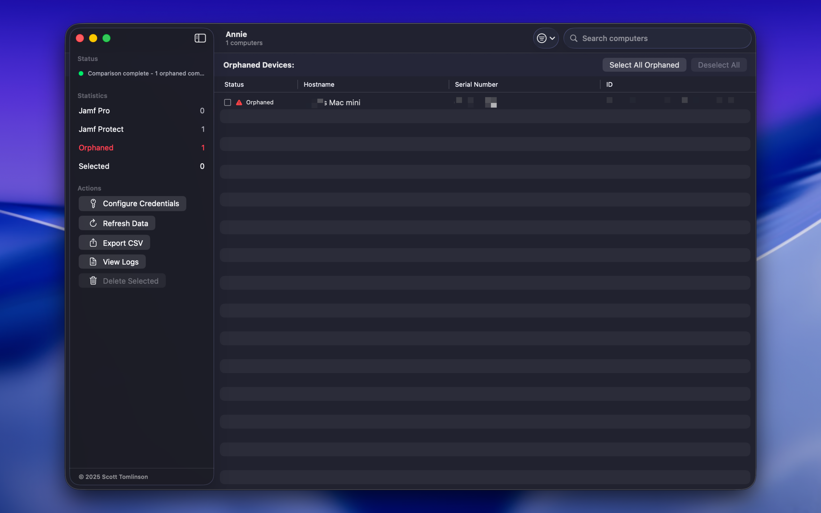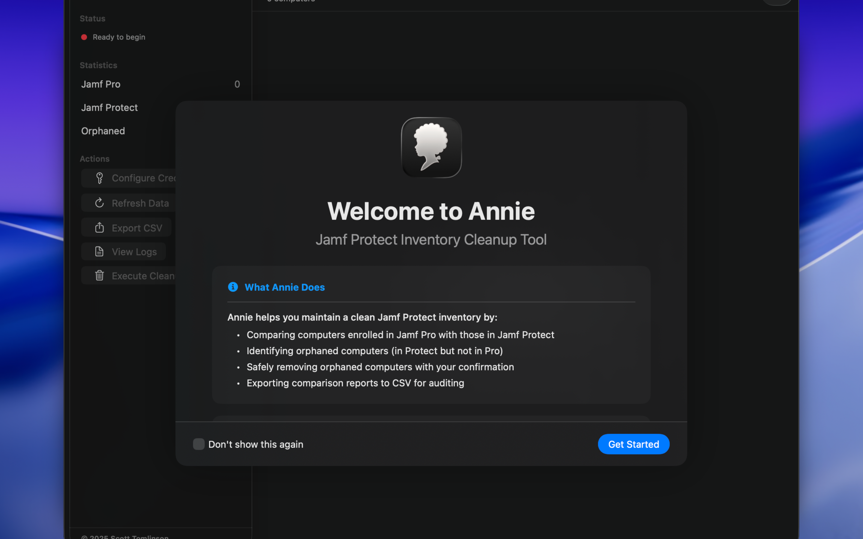 Annie is an application to help Jamf Protect administrators keep their Computer information up to date buy comparing the device list with Computer records in Jamf Pro.