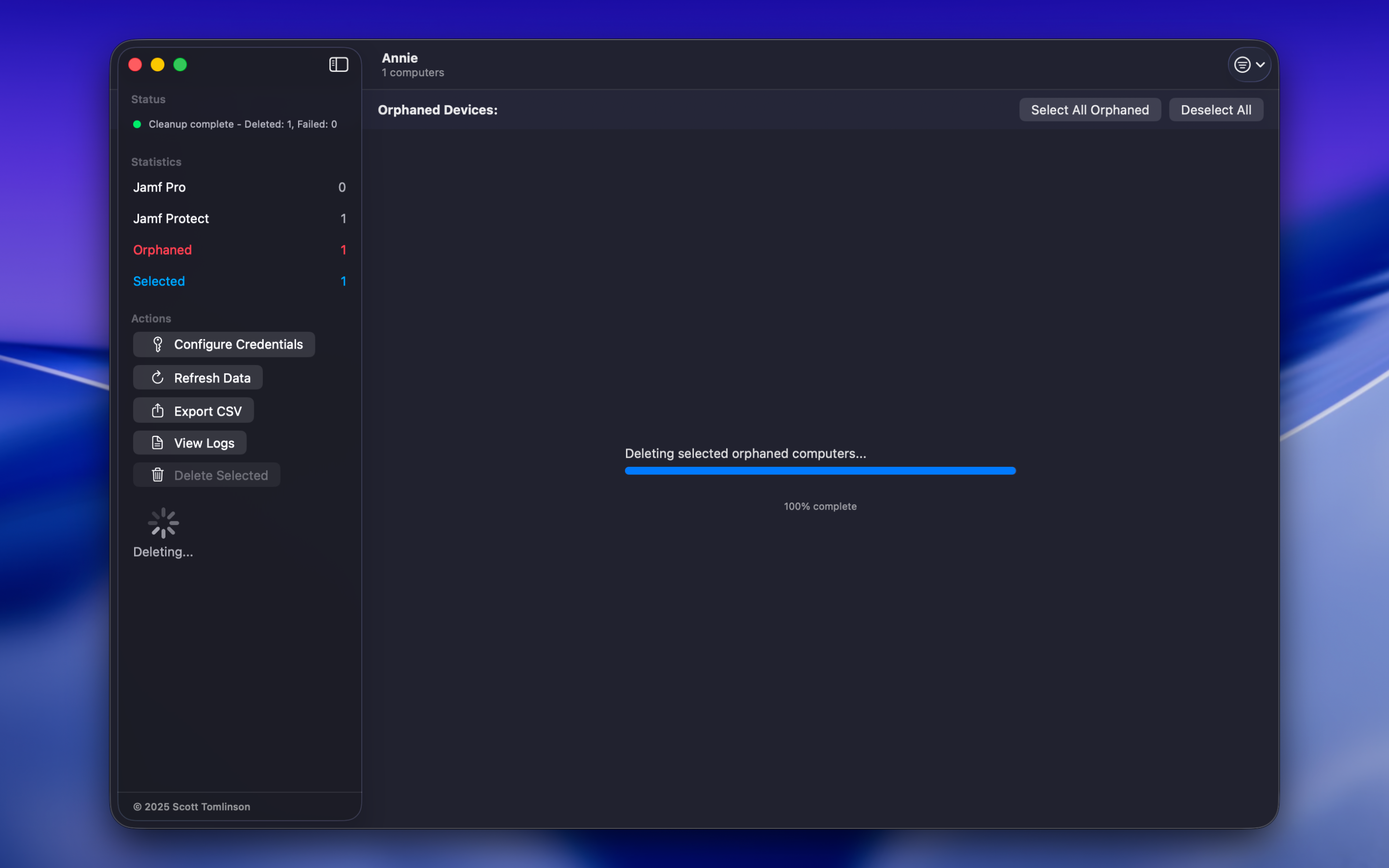 If there is a descrepency, Annie will list the orphaned devices and give administrator the option to delete the record from Jamf Protect, or export the list as a CSV file for further investigation.