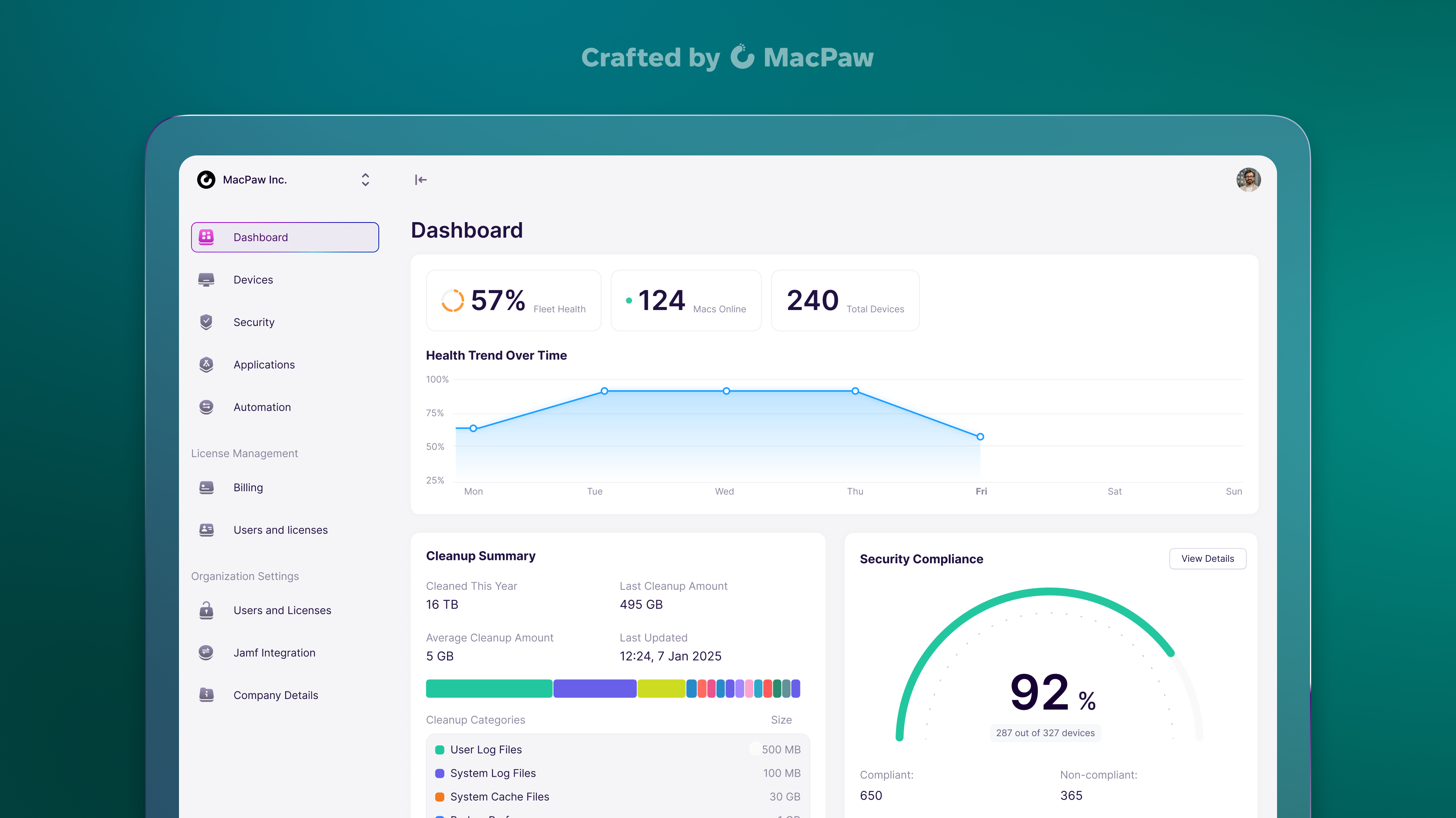 Even under a strong MDM policy, Macs accumulate junk, run slower over time, and trigger support tickets. CleanMyMac Business fills that gap: proactively maintains system health, reducing manual work for IT and frustration for users.