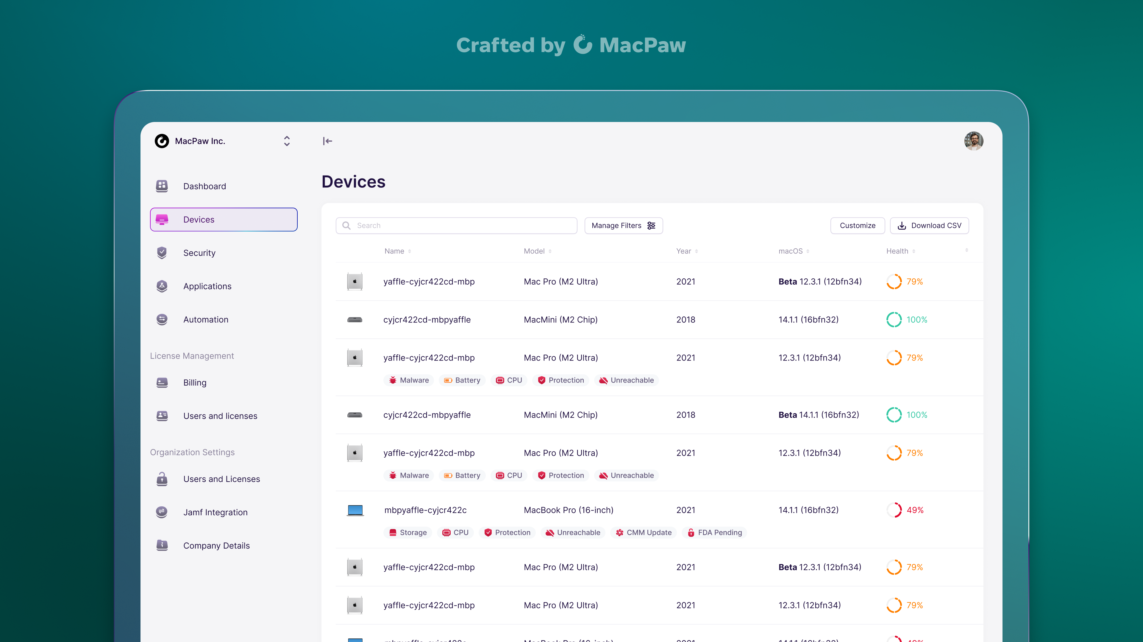 Centralized fleet health dashboard — view CPU, memory, disk, and battery metrics across all enrolled Macs