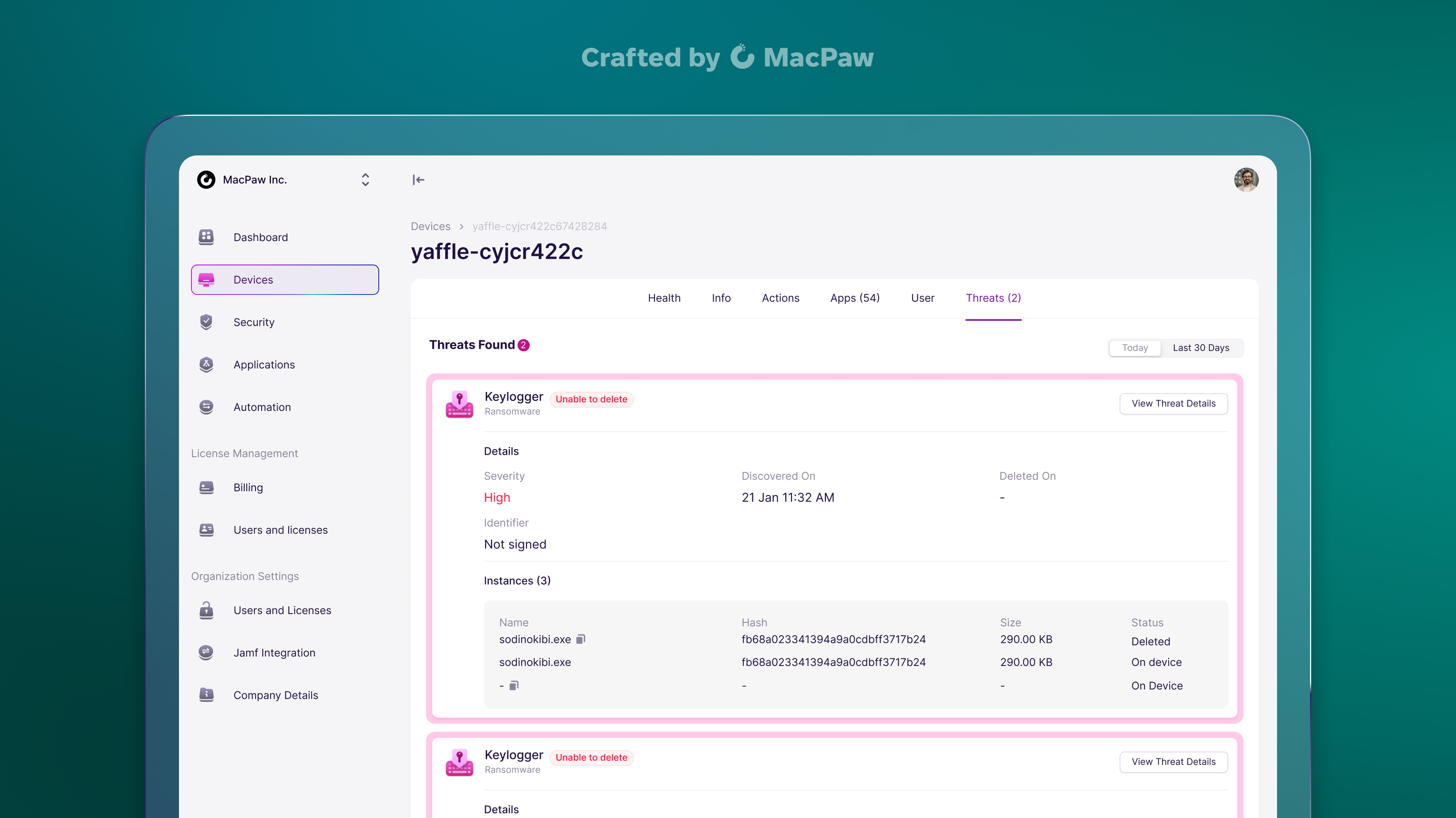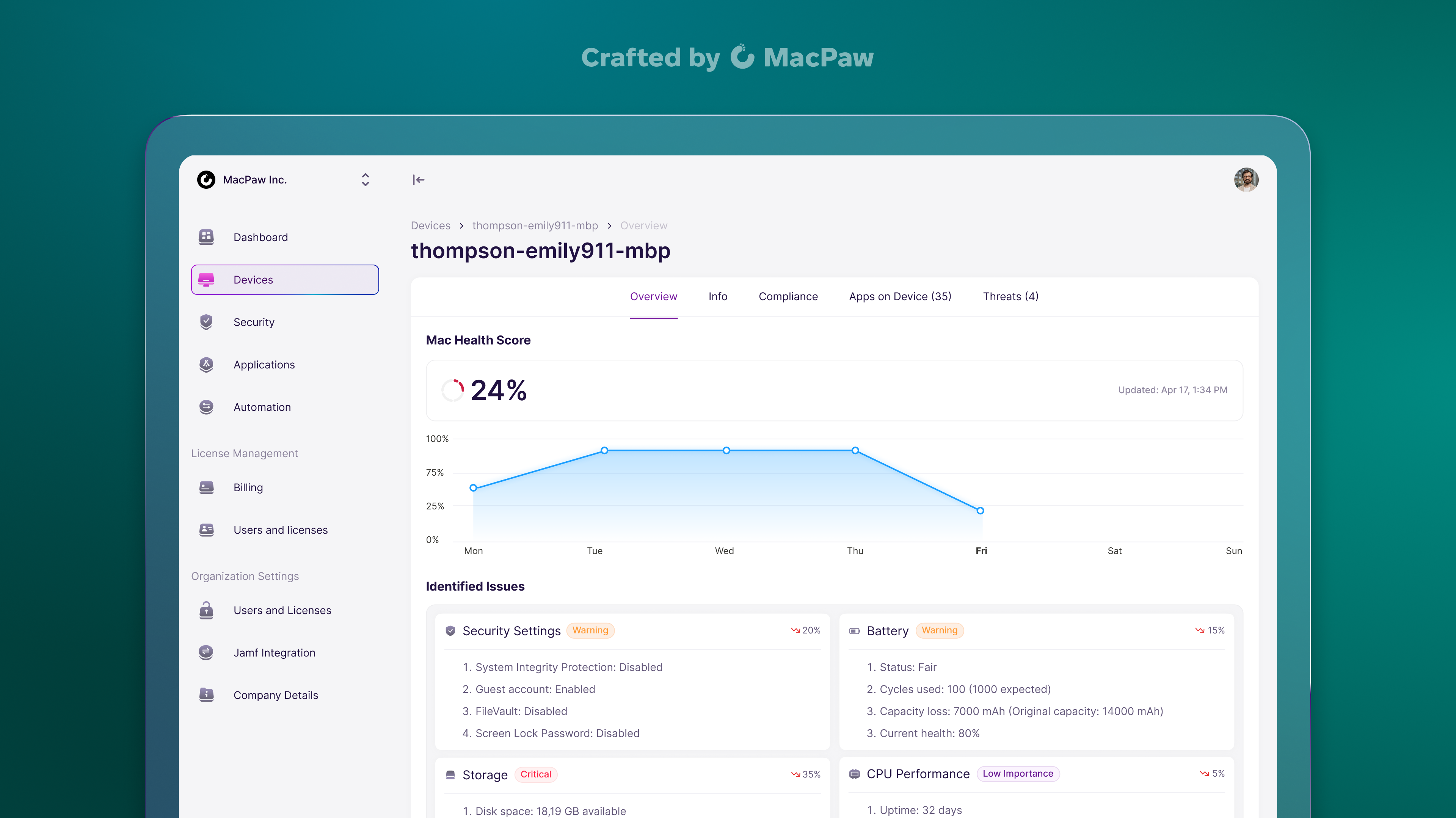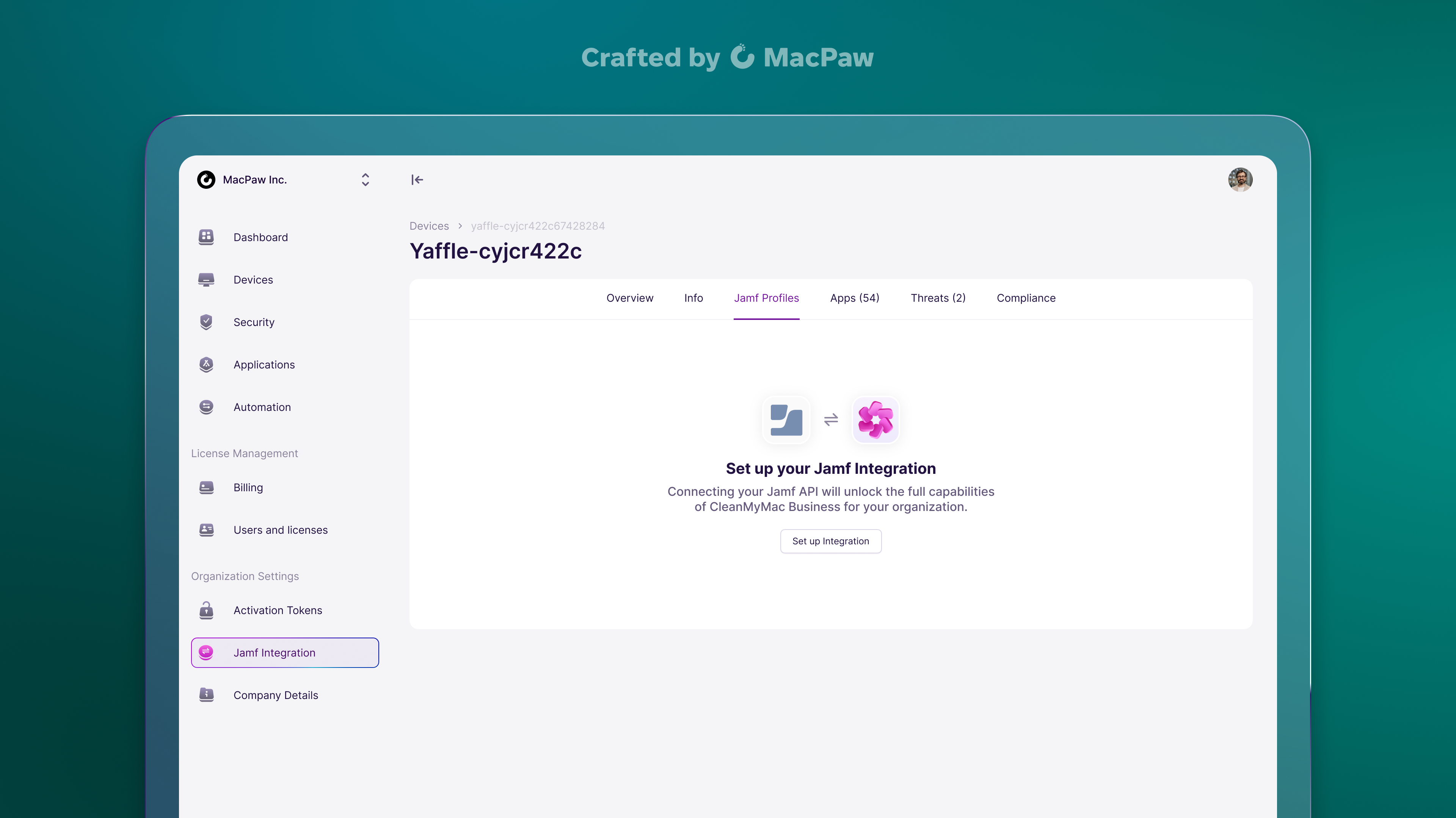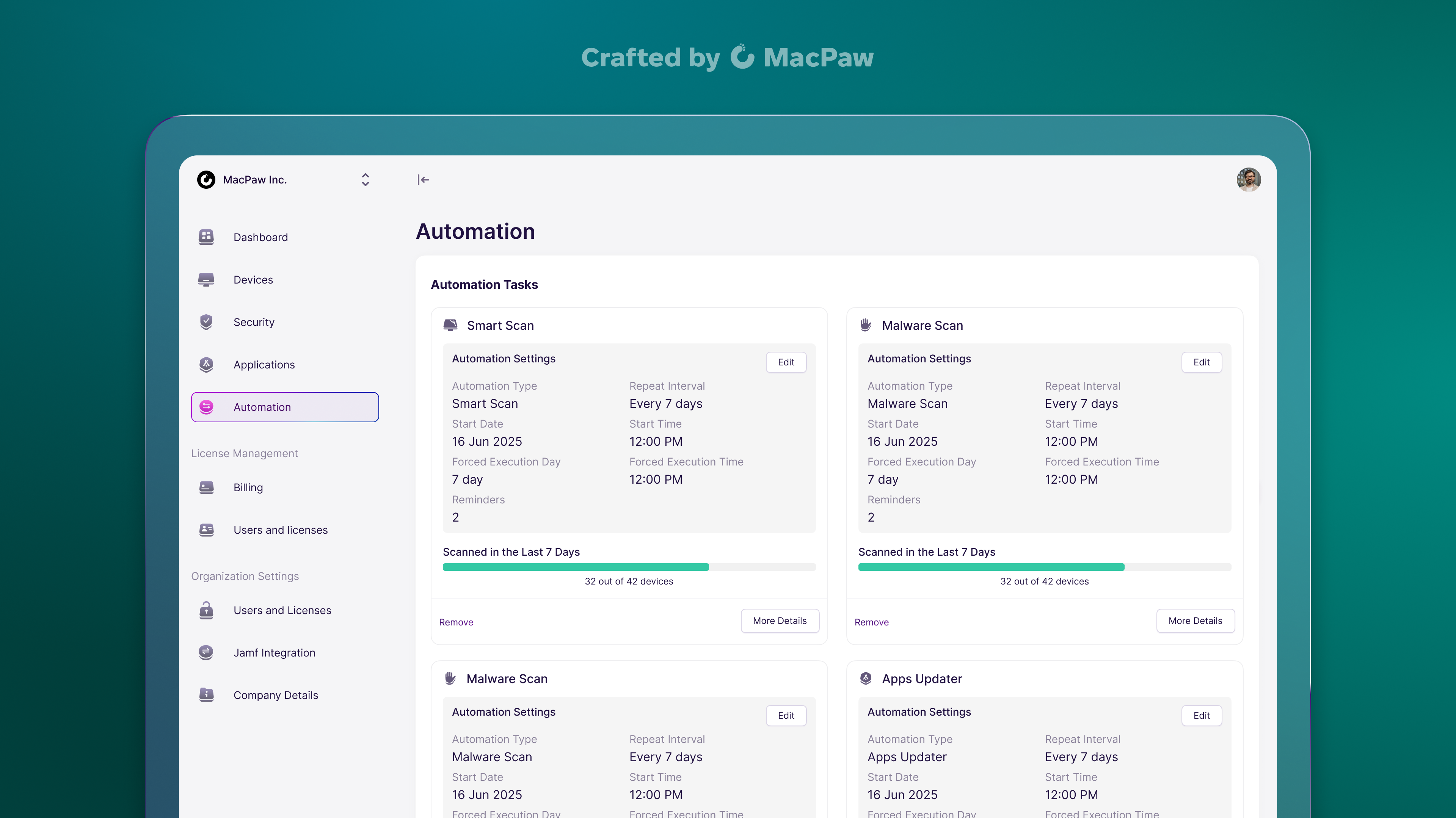 CleanMyMac Business complements your Jamf deployment by covering the performance optimization of your Mac fleet. It automates system cleanups, malware protection, and health monitoring—keeping macOS fleets running smoothly so IT teams get fewer performance tickets.