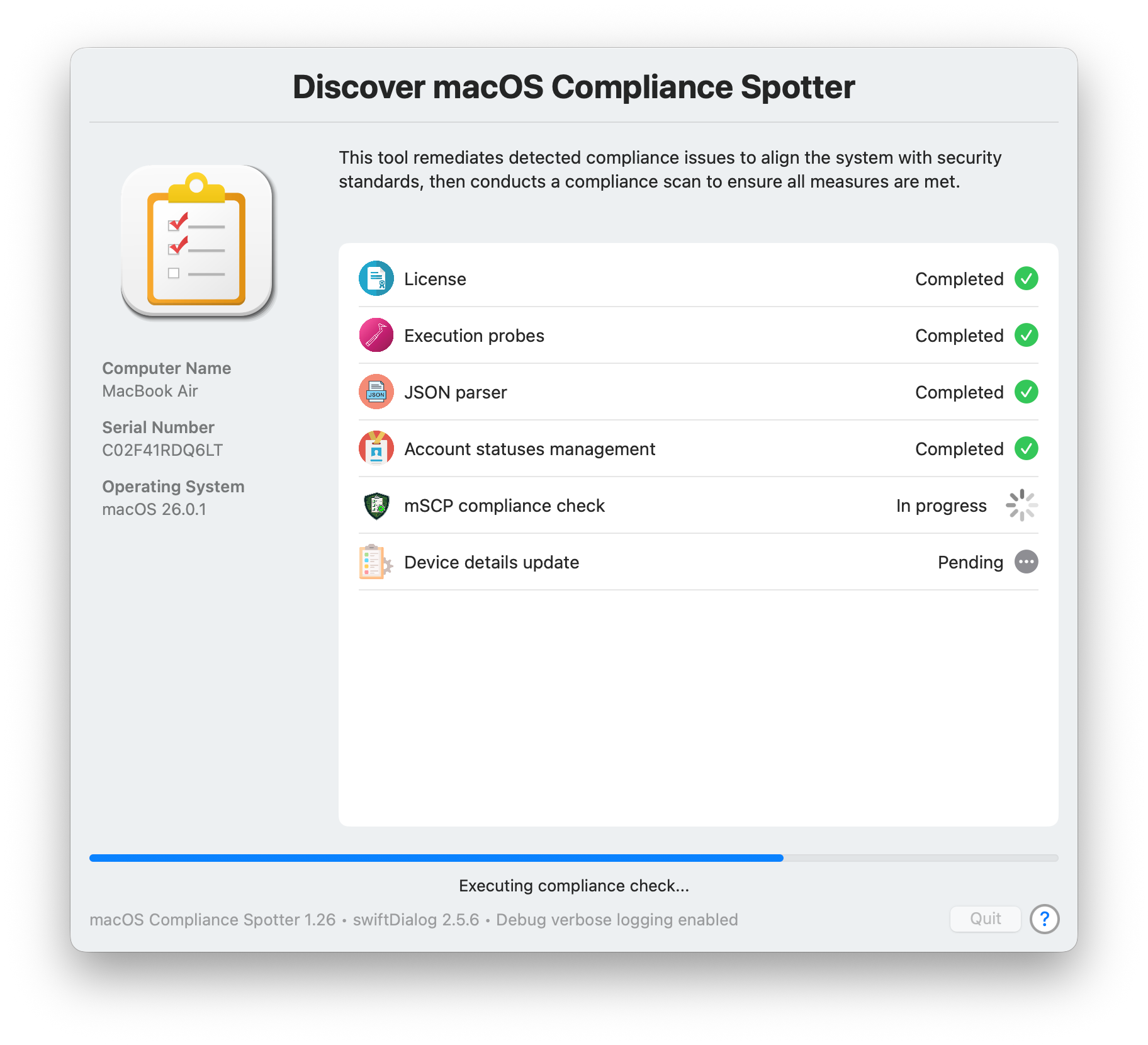 macOS Compliance Spotter (mCS) is a tool designed for IT teams in both business and educational environments to maintain and monitor ongoing compliance across macOS devices. It performs regular compliance checks using the open-source macOS Security Compliance Project (mSCP), ensuring systems adhere to established security baselines.