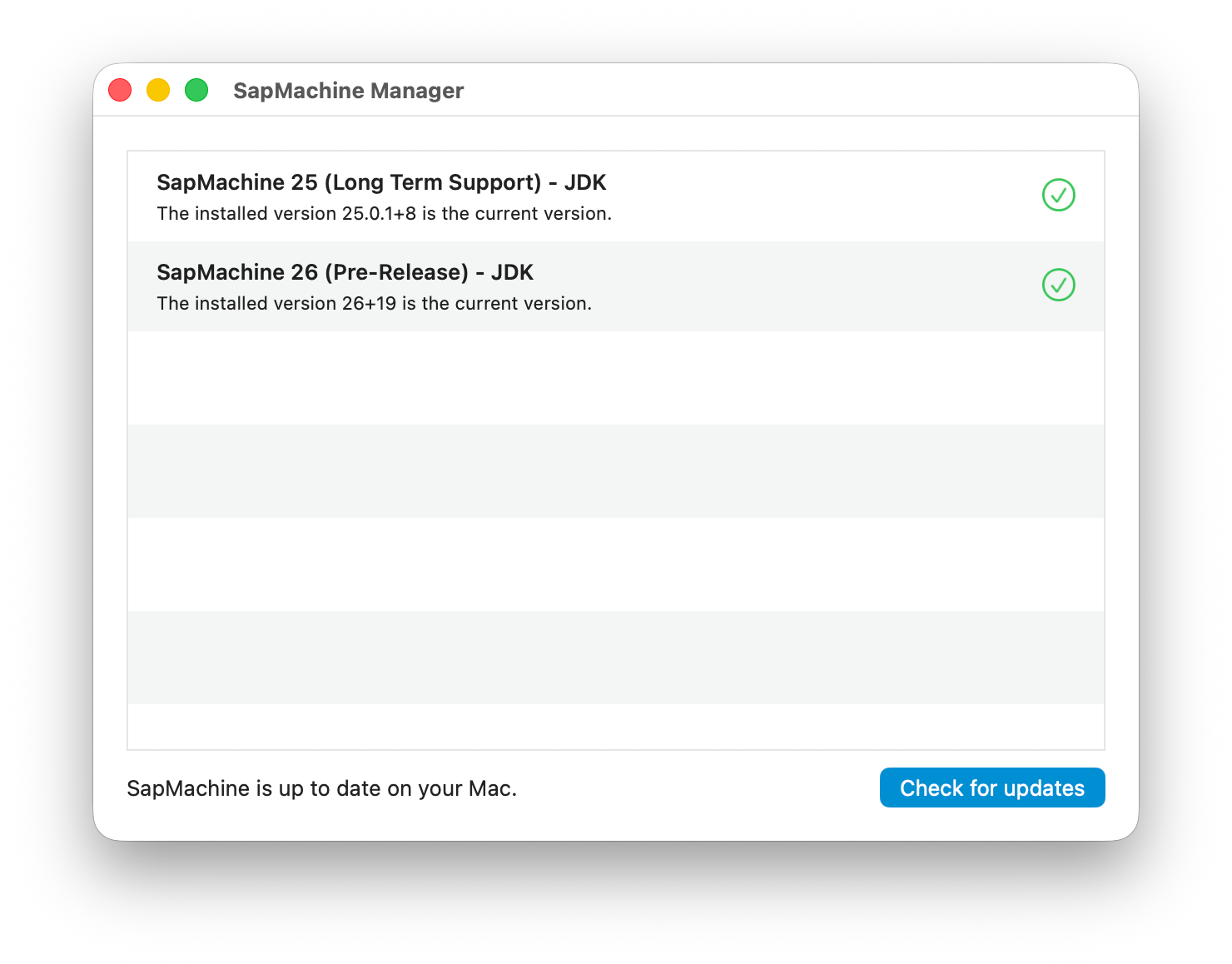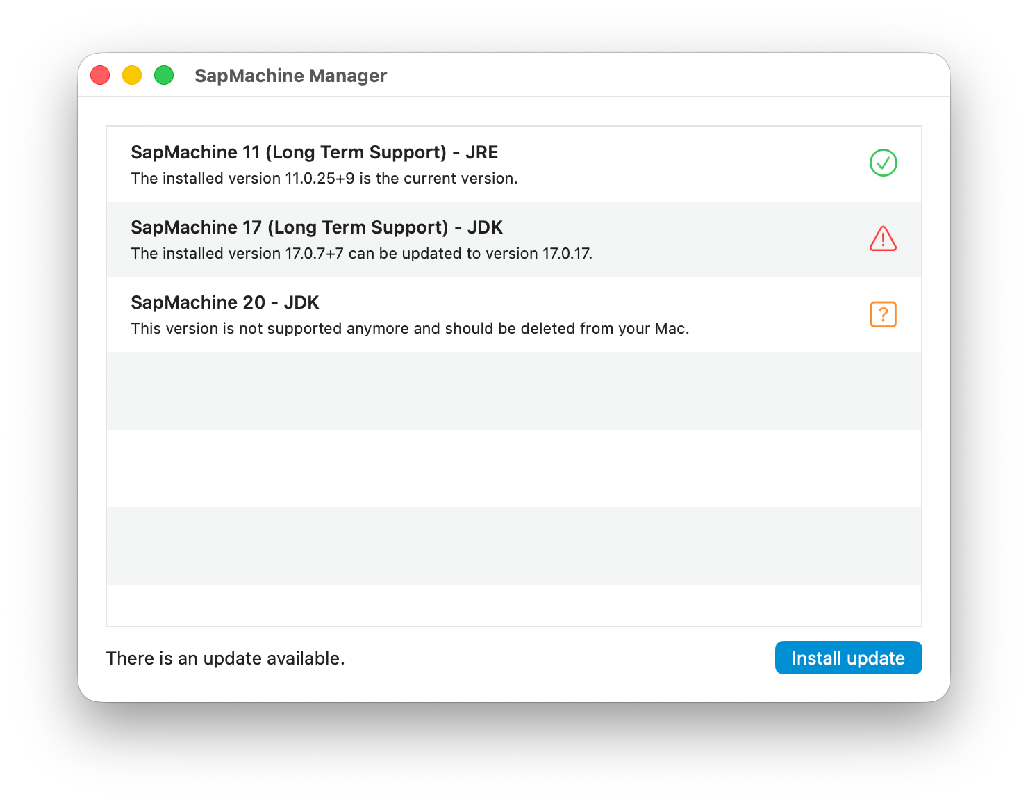 SapMachine Manager is a handy and easy-to-use tool allowing Mac users to easily install, uninstall, manage, and automatically update one or more instances of SapMachine on a Mac.