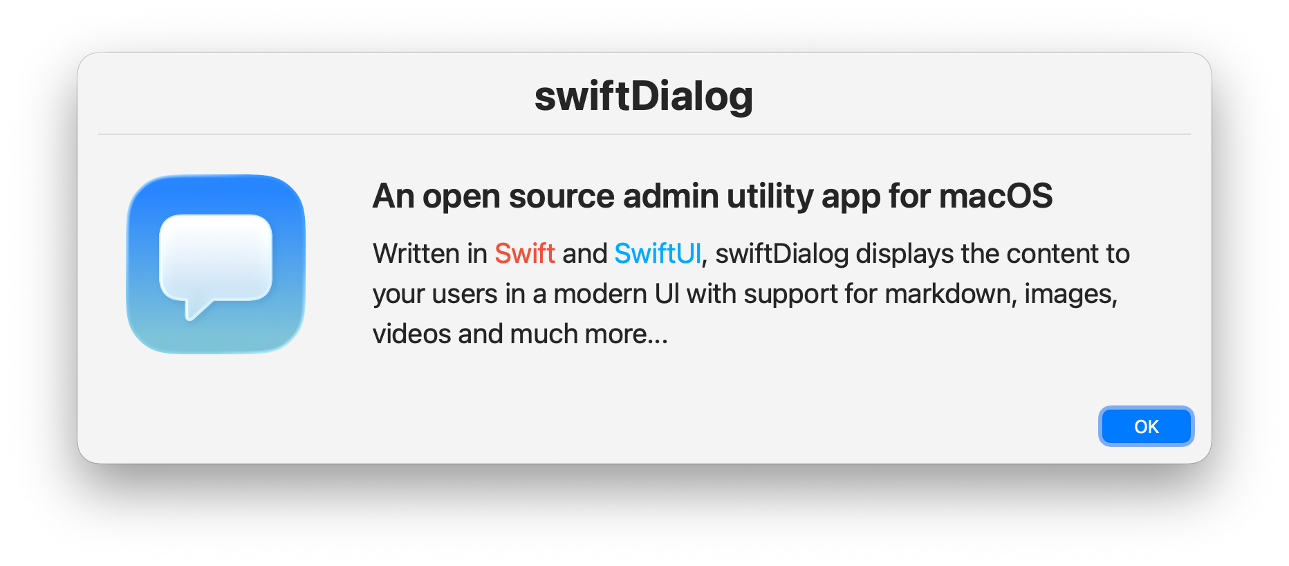 swiftDialog’s purpose is intended as a helper utility for macadmins to use via script to display a dialog to present information to a user and report the action the user took which can be later used for more script processing or simply used to display some piece of information.