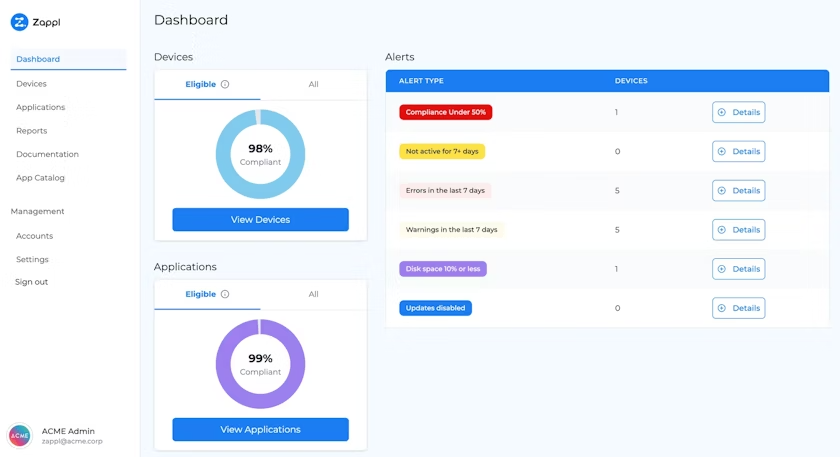 Your dedicated Zappl portal gives you complete visibility and control. Monitor real-time compliance status across your entire estate, track patch deployment, and identify gaps at a glance.