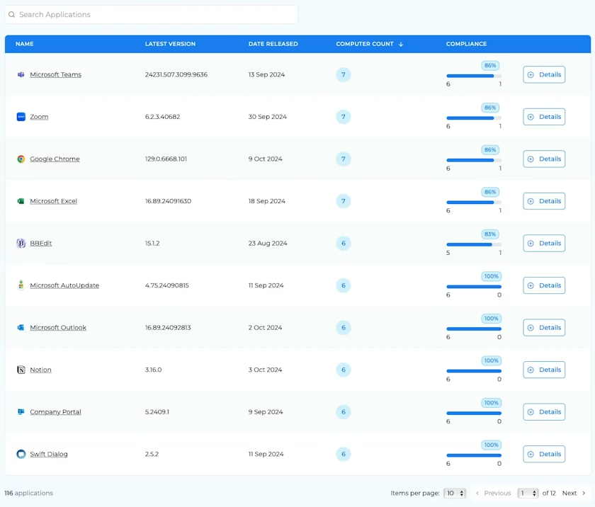 - Detailed Device Information - Drill into any Mac to see compliance, outdated apps, user deferrals, and real-time status'