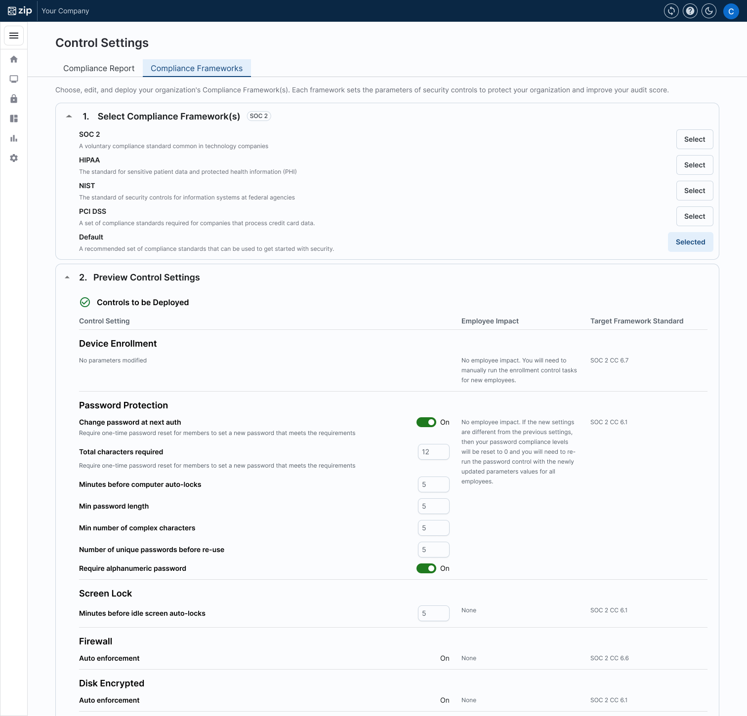 Zip Security makes it easy for organizations to set up and manage Jamf in under two weeks—no technical experience required. Using preconfigured templates that align with compliance frameworks like SOC 2, NIST 800-171, and more, you can enforce firewall settings, screen locks, disk encryption, OS version updates, and activation lock with a single click across all your devices. Once deployed, Zip continuously remediates any device that drifts out of policy—so you stay secure by default.
